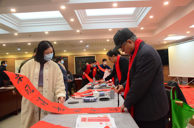 1月29日,市總工會在市職工活動中心舉行“迎新春 送萬福 進萬家”書法志愿服務公益活動舉,邀請到市書法家協會的5位書法家現場書寫春聯、福字。公司勞模代表和職工代表與渤?;钊⒔贿\集團的代表一道,參加此次活動。