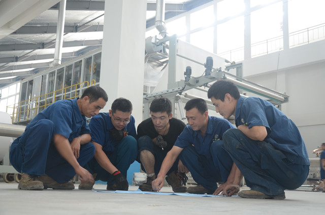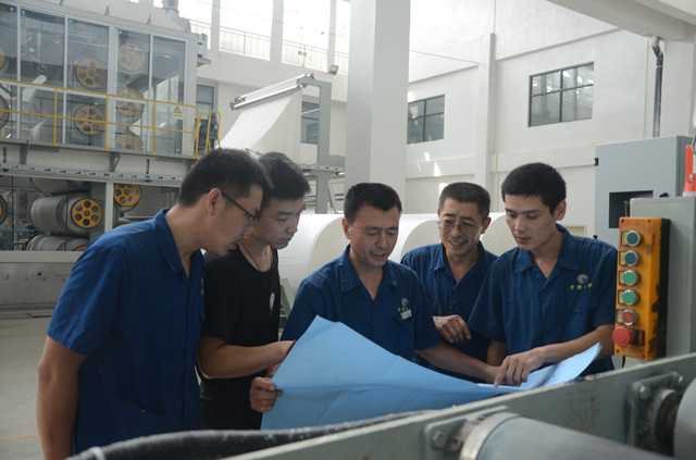 圖為家紡車間機電維修人員正在生產現場,對照設備圖紙進行現場培訓和討論。