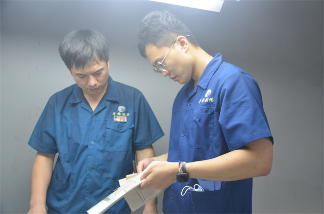 家紡車間卞兆穩(wěn)(右一)等人,正在為印花機安裝新配件。