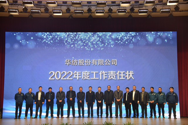 工作責任狀簽訂儀式上,盛守祥依次與總經理閆英山、質量總監李風明、總工程師羅維新、安全總監孫中然、財務總監劉水超、法務總監趙玉忠、人力行政總監孫玉濤、董事會秘書丁澤濤,服裝面料分公司總經理王超、花布分公司總經理張力前、家紡分公司總經理成如海、面料車間主任曹劍、花布車間主任劉國鋒、家紡車間主任王旭洲、服裝車間主任晁金光、家紡成品車間主任董魯波,簽訂《2022年工作責任狀》。閆英山分別與王超、張力前、成汝海及各分公司所屬車間主任曹劍、晁金光,劉國鋒,王旭洲、董魯波,簽訂《2022年工作責任狀》。大會由團委書記陳冰主持。