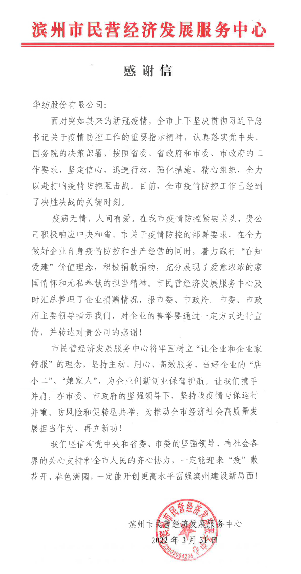 “疫病無情,人間有愛。在我市疫情防控緊要關頭,貴公司積極響應中央和省、市關于疫情防控的部署要求,在全力做好企業自身疫情防控和生產經營的同時,著力踐行‘在知愛建’價值理念,積極捐款捐物,充分展現了愛意濃濃的家國情懷和無私奉獻的擔當精神……”這是3月31日濱州市民營經濟發展服務中心發給公司感謝信中的一段話。