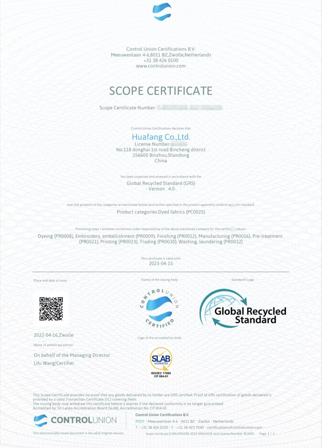 公司積極響應國家發展改革委、商務部、工業和信息化部《關于加快推進廢舊紡織品循環利用的實施意見》,根據全球有機紡織品GOTS/OCS及全球回收標準GRS等國際相關標準, 2022年于3月份通過權威機構的現場審核,順利取得GOTS/OCS/GRS證書。