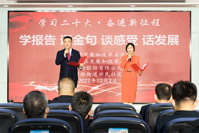 為持續(xù)深入學(xué)習(xí)領(lǐng)會(huì)、全面準(zhǔn)確把握黨的二十大精神,12月2日,濱州市發(fā)展改革委聯(lián)合濱城區(qū)發(fā)展和改革局、華紡股份有限公司、市西街道興民社區(qū)舉辦“學(xué)習(xí)二十大·奮進(jìn)新征程·學(xué)報(bào)告、誦金句、談感受、話發(fā)展”活動(dòng)。團(tuán)市委副書記丁寶冬、華紡股份有限公司黨委委員、人力行政總監(jiān)孫玉濤出席活動(dòng)。市發(fā)展改革委、濱城區(qū)發(fā)展和改革局、華紡股份有限公司、興民社區(qū)黨員代表參加活動(dòng)。