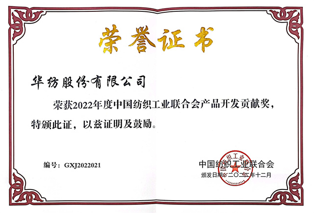 公司獲評(píng)中國(guó)紡織工業(yè)聯(lián)合會(huì)產(chǎn)品開發(fā)貢獻(xiàn)獎(jiǎng)