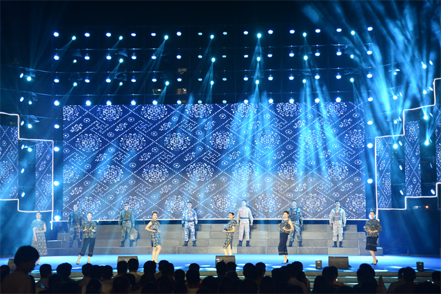 此次文藝匯演中,公司參演人員盡著由公司設計生產的服裝產品。藍印花布系列服飾以藍白分明、清新明質、純真素樸、典雅大方的藝術特點體現了濱州大地濃厚的文化底蘊。