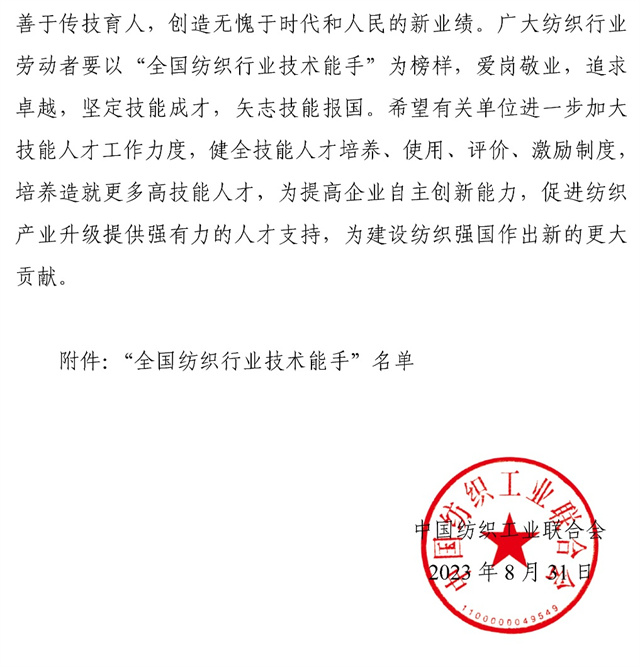 導讀:近日,中國紡織工業聯合會發布了授予在2023年全國紡織行業勞動技能競賽中取得前18名的紡織企業員工為“全國紡織行業技術能手”榮譽稱號的決定,