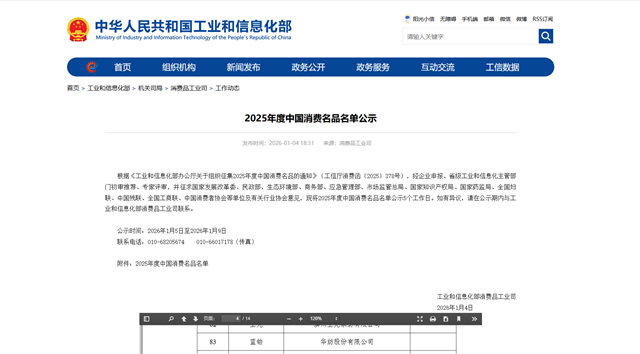 導讀:近日,工業和信息化部公布了2025年度中國消費名品名單。