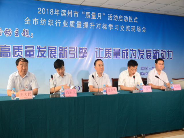 9月5日,2018年濱州市“質(zhì)量月”活動啟動儀式暨全市紡織行業(yè)質(zhì)量提升對標學(xué)習交流現(xiàn)場會在公司科技產(chǎn)業(yè)園舉行,會議由市政府秘書長尹月林主持,副市長、公安局長趙永生,市質(zhì)監(jiān)局黨委書記商新生,濱城區(qū)副區(qū)長鄭同忠,公司黨委書記、董事長王力民出席啟動儀式。